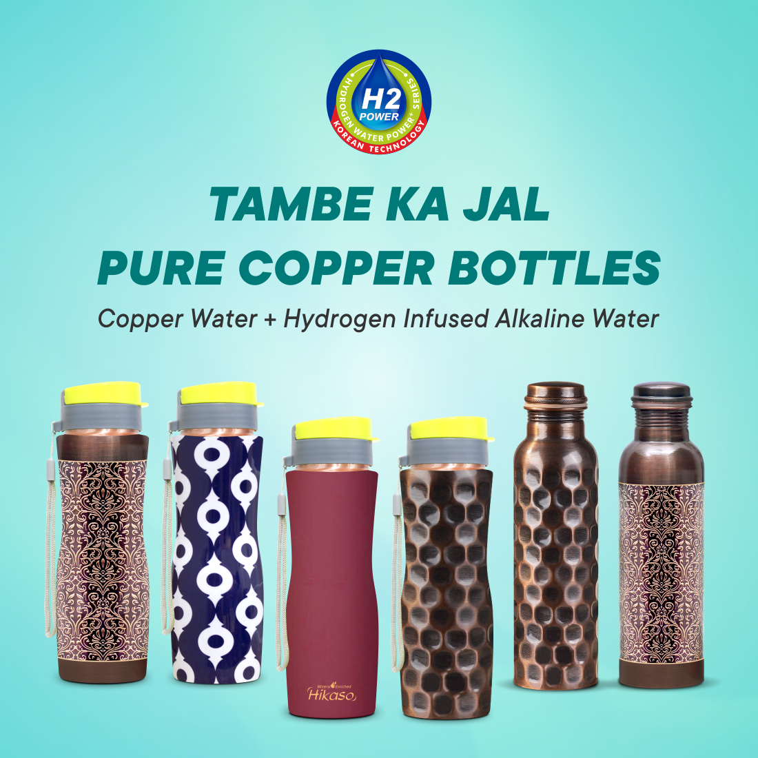A sleek and modern Alkaline minerals-infused copper sipper bottle with a unique Phulkari print and a glossy texture offering an aesthetic and functional way to stay hydrated on the go, delivering the benefits of Alkaline water.